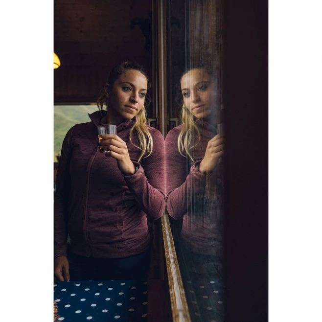 Veste thermique légère, pour femme, conçue pour les activités en montagne et adaptée au quotidien avec un détail contrasté de matière, intérieur/extérieur. Cette couche thermique est légère et offre une grande capacité d’évacuation de l’humidité grâce à la matière bi-face dotée d’une surface intérieure en mesh ventilée et une surface extérieure tricotée d’aspect chiné à séchage rapide.