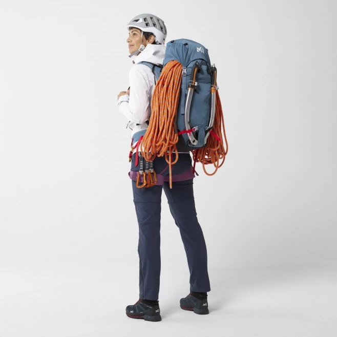 Pensé pour optimiser le confort des montagnardes lors de leurs ascensions les plus ambitieuses, ce sac à dos présente une ergonomie adaptée à la morphologie féminine, avec des bretelles dégageant la poitrine et une longueur de dos adaptée. Très léger, il possède un volume compact afin d’éviter de vous encombrer dans les voies, ainsi que des renforts sur l’intérieur assurant une résistance à toute épreuve malgré le poids du matériel et les frottements contre la roche. Une poignée spécifique permet de le hisser en hautes de voies, ce sac pour l’alpinisme et le ski de randonnée est également capable d’emporter une corde, des piolets et des skis. Le rabat supérieur autorisant une extension de volume de 10 litres peut être enlevé pour gagner du poids.
